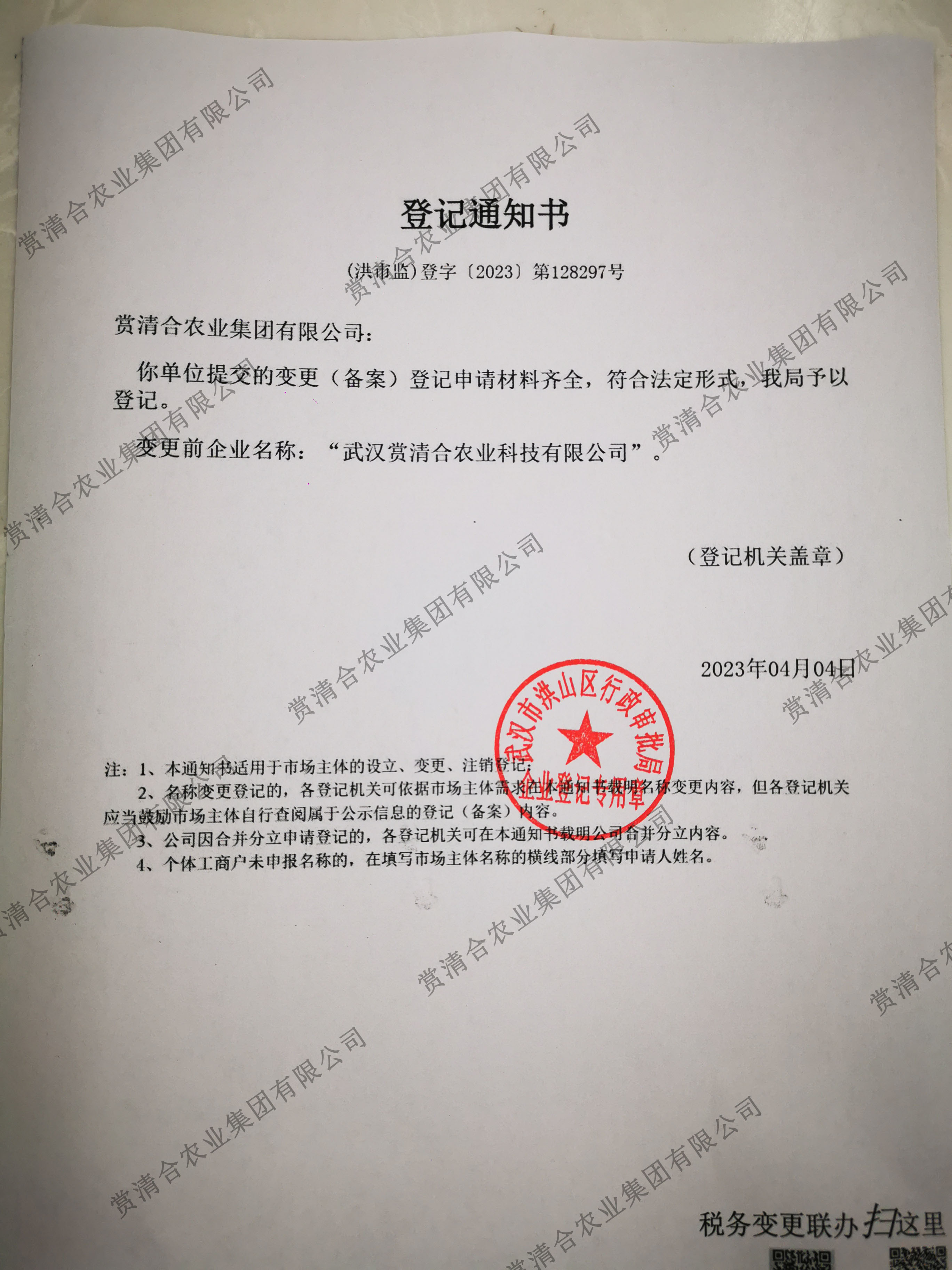 关于公司名称变更的通知尊敬的客户、供应商及合作伙伴:因本公司业务发展需要,公司名称“武汉赏清合农业科技有限公司”变更为“...